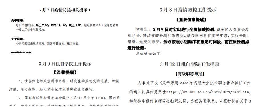 一是通过落实东区机自大楼网格化管理体系、师生一生一策、每日工作例会、下发工作提示等机制,迅速摸清了师生底数与行动轨迹,做到无一遗漏,学院各部门责任明晰、工作有序推进。