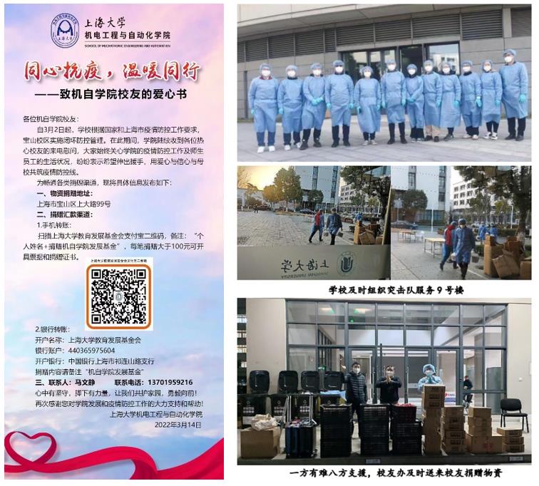 根据国家和上海市疫情防控工作要求,上海大学完成14天的实行闭环防控管理后,从3月17日零时起由封闭管理进入准封闭管理,我院领导班子第一时间落实学校准封闭管理期间的各项工作指示,按要求严格做好疫情防控,用真心回应学院师生需求,同心协力守好校园一方净土,凝心聚力调动各种资源,广大校友和关心学院发展社会人士纷纷响应号召,捐赠紧缺物资,饱含拳拳爱心的一桩桩物资不断涌向学校抗疫一线。