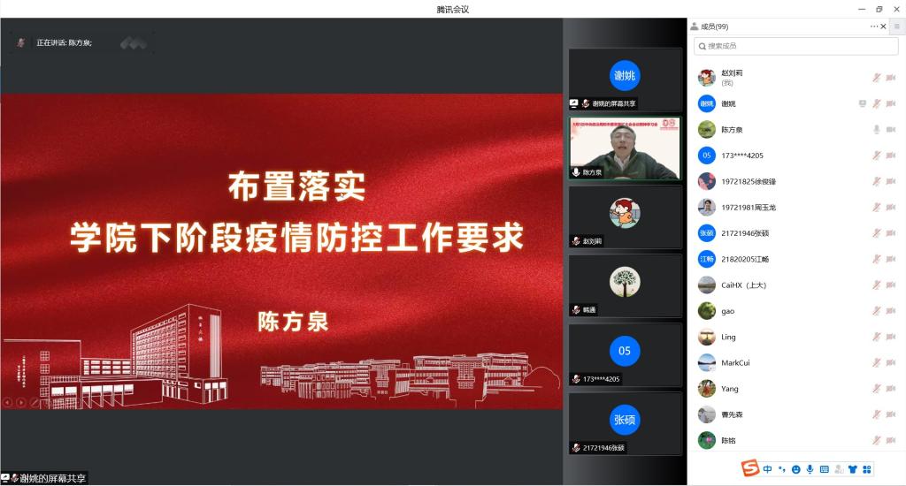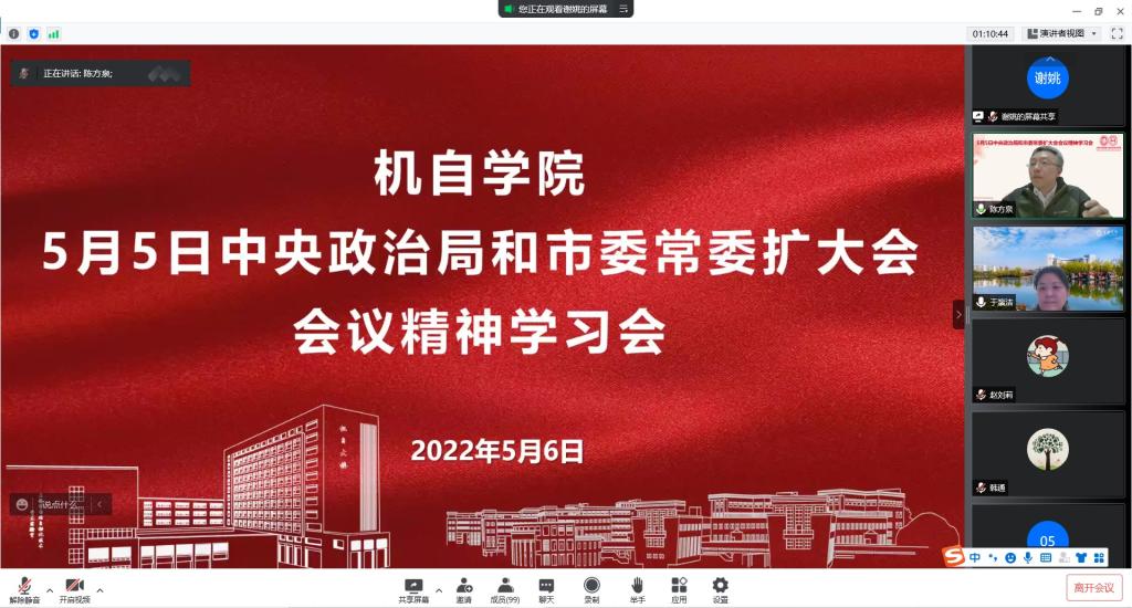 5月6日晚7:00,我院召开了“5月5日中央政治局会议精神和上海市市委常委扩大会议精神“的线上学习会,传达习近平总书记重要讲话精神,明确工作要求。院系党政班子全体成员、各系(中心)办公室主任、学院组织员、各总支组织员、全体师生支部书记、全体辅导员,近100名师生共同在线学习。会议由党委副书记、院长于瀛洁同志主持。