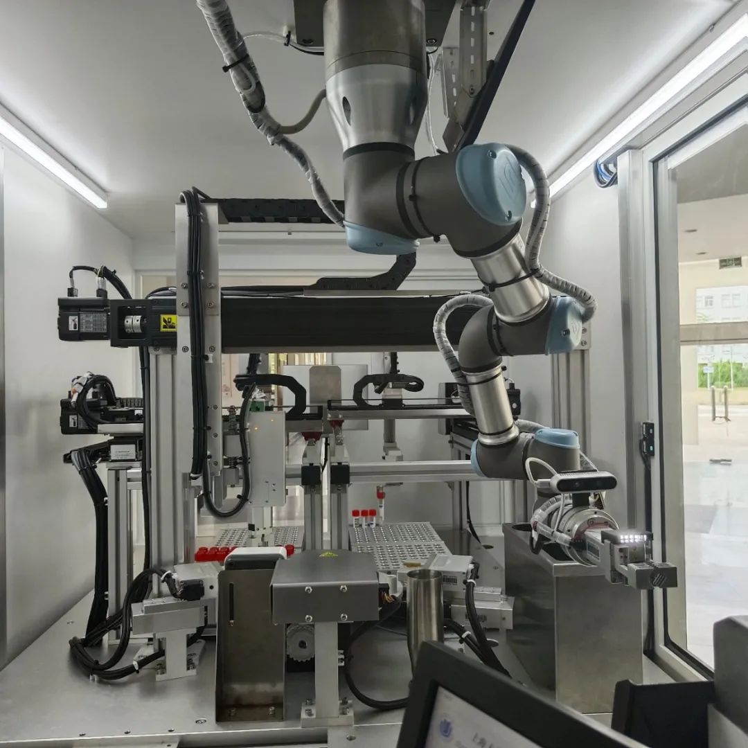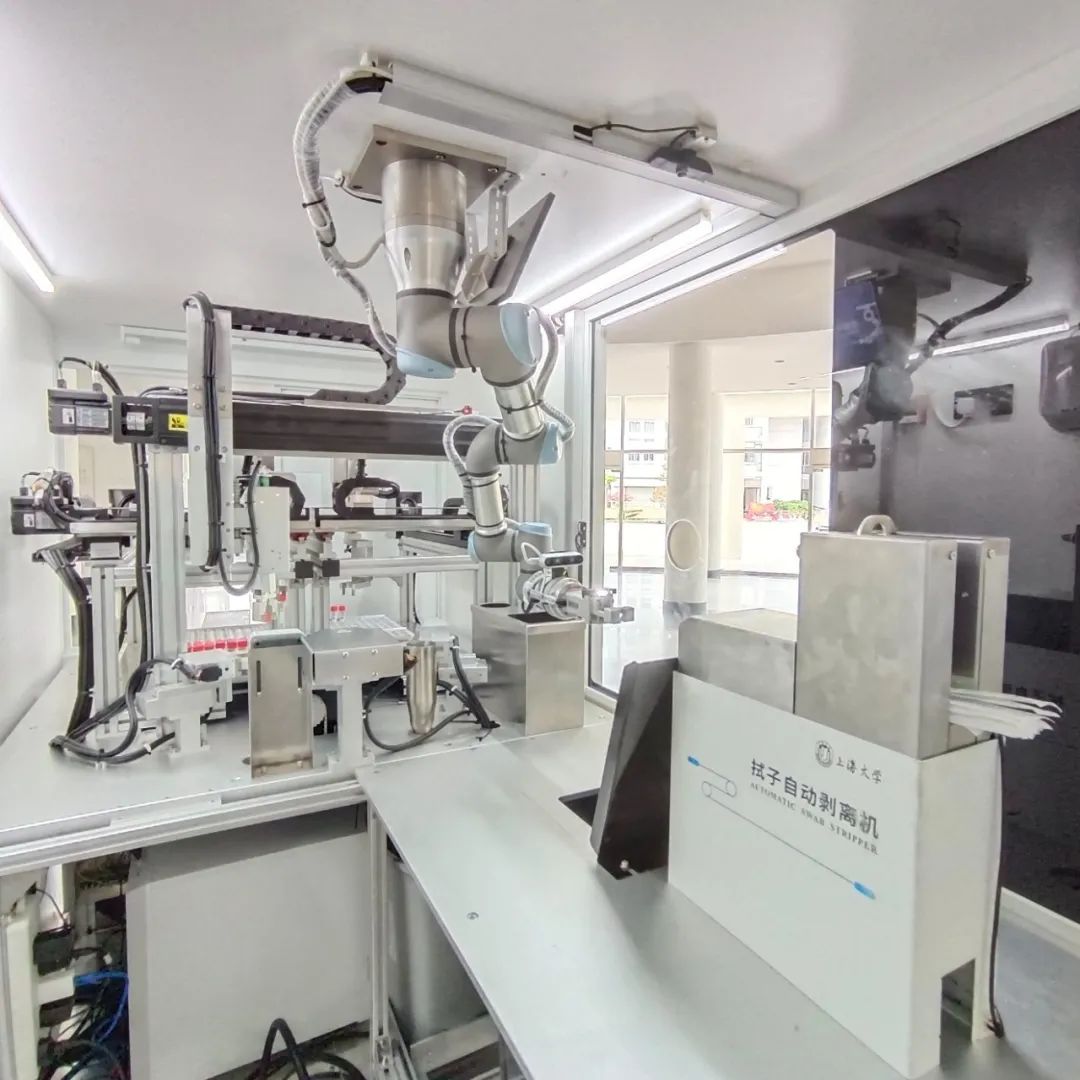 科技抗疫赋使命、上海大学勇担当。上海大学核酸采样机器人具有“全自动、非接触、大通量、高快速、云监控”等特色,它将灵巧机械臂和小型自动化生产线有机融合为一体,从拭子剥离、定位夹取、试管上位、试管扫码、口腔采样、样本剪切、试管下位到采样末端部位消毒等全流程实现了真正的“全程自动化”。