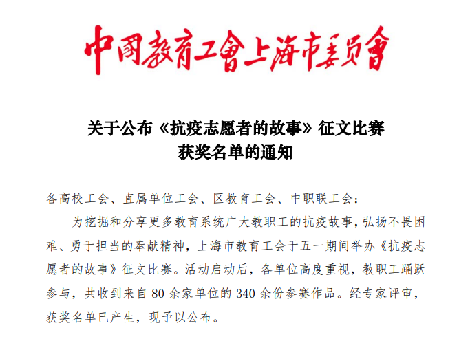 为挖掘和分享更多教育系统广大教职工的抗疫故事,弘扬不畏困难、勇于担当的奉献精神,上海市教育工会于五一期间举办了《抗疫志愿者的故事》征文比赛。我院机自系教师赵旻以疫情期间担当志愿者的亲身经历投稿参与了本次活动。