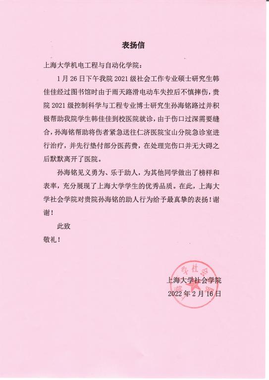 2月16日,我校社会学院硕士研究生韩同学向我院送来了一封表扬信,并讲述了我院2021级博士研究生孙海铭同学帮助她的故事。2022年1月26日下午,韩同学在我校宝山校区图书馆附近不慎摔伤,孙海铭同学在第一时间伸出了援手,帮助韩同学前往医院就诊并垫付了部分医疗费用。