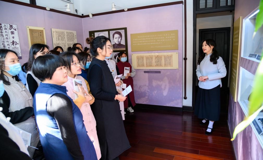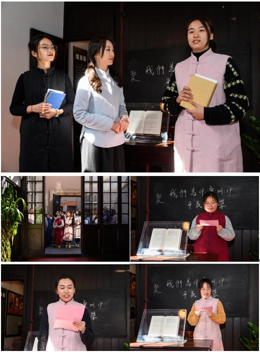 我院17名党员代表与来自静安区各行业的优秀巾帼代表共同排演了一场特殊的沉浸式党课。在平民女校的老建筑空间中,同学们通过扮演王一知、王剑虹、丁玲、“校务主任李达”等,通过融合表演和互动体验,身临其境对话百年前女性运动先驱,帮助同学们体验旧时代女性的觉醒与抗争,探寻近代以来中国妇女解放运动史,更好地研究和学习这段珍贵史迹。