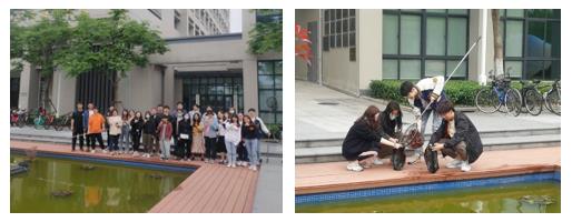 学院社团核心理事会携手自动化、电气系本科生党支部清洁学院大楼前水塘、投喂塘中乌龟、小鱼等动物,同学们无一不感叹学校绿色生态环境。