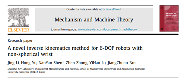 近日,上海大学我院机械自动化工程系李静、沈南燕团队在工业机器人领域的研究成果“A Novel Inverse Kinematics Method for 6-DOF Robots with Non-Spherical Wrist”在SCI一区(工程:机械)TOP期刊《Mechanism and Machine Theory》(MMT,CS=6.5,IF=3.312)上公开发表,上海大学为论文第一单位,李静老师为论文第一作者,沈南燕老师为通讯作者,研究生余泓为论文第二作者。