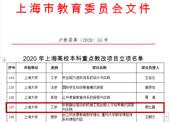 近日,上海市教委发布《上海市教育委员会关于公布2020年上海高校本科重点教改项目立项名单的通知》(沪教委高〔2020〕55号),批准并公布了共210项2020年上海高校本科重点教学改革项目的名单,机自系副主任蔡红霞老师主持的《科教融合驱动的机械工程创新人才培养模式探索与实践》获得立项资助。