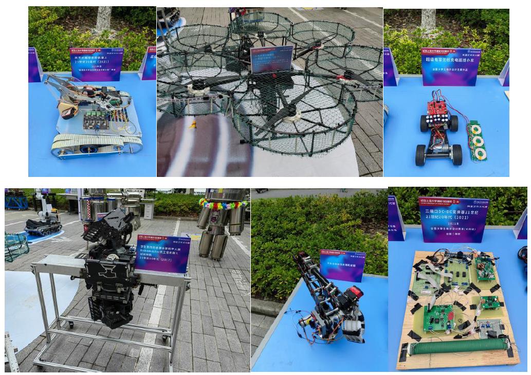 在学生科创作品展区,展出了“国家级大学生创新创业训练计划”项目关节式履带抓取机器人,全国大学生电子设计竞赛(本科组)全国二等奖三端口DC-DC变换器等,全国大学生智能汽车竞赛四轮组、单轮组参赛小车,特别是上海大学自强队和SRM 战队等大学生科创团队的一些成果,体现了机自学子自强不息、全力以赴,为了梦想努力拼搏的精神状态。也体现出学院依托“实践教学+竞教结合+科教融合+产教融合+国际联合”协同育人机制,扎实推进“三全育人”改革落地生效,培养全面发展的机电测控卓越创新人才。