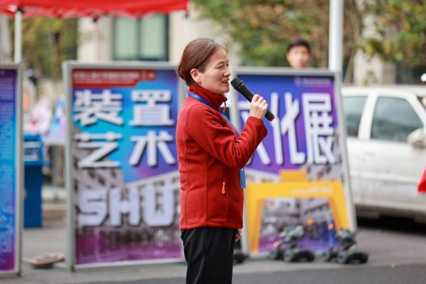 上海大学党委常委、副校长聂清宣布“青春心向党,奋进新征程——装置艺术文化展”开幕。