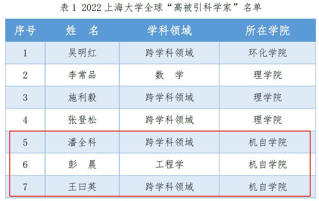 11月15日,科睿唯安公布2022年“全球高被引科学家”名单。来自全球69个国家和地区的6938名科学家入选高被引科学家名单。我院彭晨、潘全科、王曰英3位教授入选(上海大学共7人上榜)。入榜这份备受期待的名单的自然科学家和社会科学家均发表了多篇高被引论文,其被引频次位于同学科前1%,彰显了他们在同行之中的重要学术影响力,是所在研究领域具有重大和广泛影响的顶尖科学人才。
