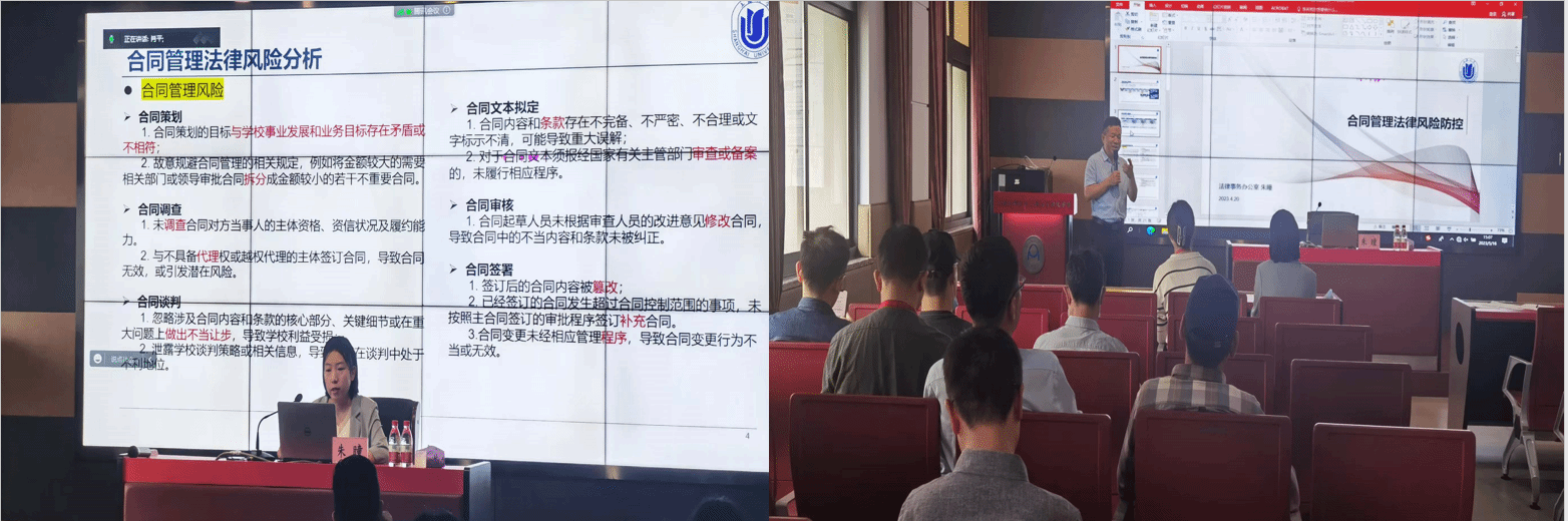 为服务广大师生加强了解法律相关知识,提升法律风险防控意识,依法规范合同签订,5月16日下午学院特邀学校法律事务办公室的朱瞳老师在机自大楼伯时会堂为广大师生开设《合同管理法律风险防控》讲座。学院科研副院长苗中华和各系(中心)科研口负责人、科研秘书以及广大师生参加了此次讲座。讲座由副院长苗中华主持,线上和线下同时进行。