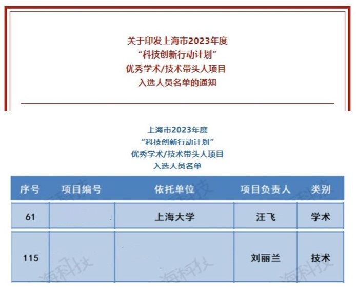 近日,上海市2023年度“科技创新行动计划”优秀学术/技术带头人项目的评审立项工作已经结束。根据专家评审和公示结果,我院刘丽兰教授入选上海市优秀技术带头人计划、汪飞教授入选上海市优秀学术带头人计划。