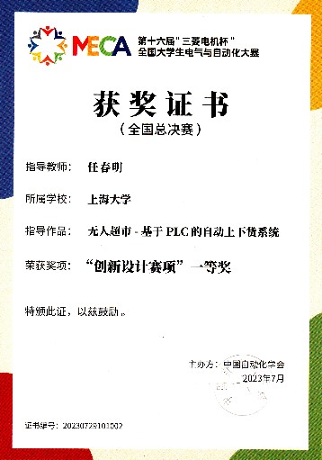 电气工程系资深集成电路工程师任春明指导本科生团队刘广雨、余裔秾、伍明标,荣获第十六届“三菱电机杯”全国大学生电气与自动化大赛全国总决赛一等奖,参赛题目为“无人超市-基于PLC的自动上下货系统”。大赛由中国自动化学会主办,是业界历史较悠久、影响力较大、学术水平较高的赛事之一,今年共吸引来自全国的271所高校、825支队伍报名参加,为自动化、智能化人才培养发挥了积极作用,培养和输送更多的青年人才助力中国式现代化发展事业。