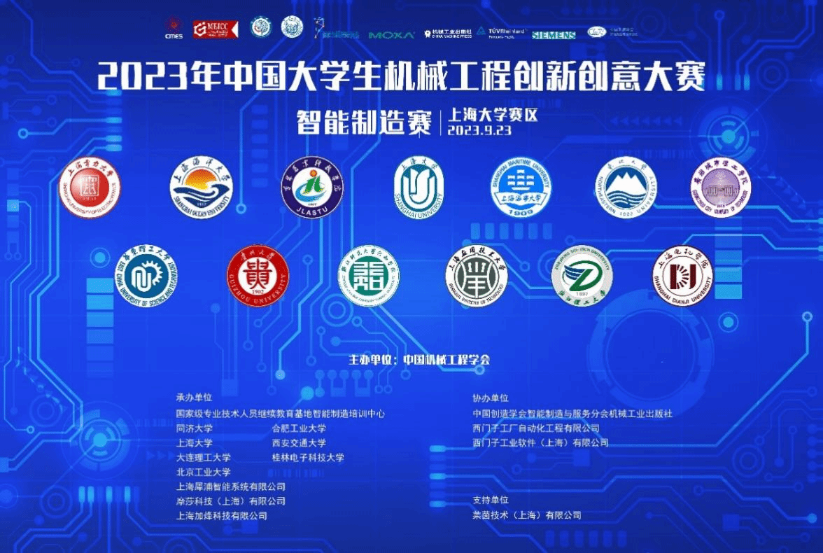 9月23日,由中国机械工程学会主办;国家级专业技术人员继续教育基地智能制造培训中心、上海大学、同济大学等多所高校及企业联合承办;中国创造学会智能制造与服务分会、机械工业出版社、西门子工厂自动化工程有限公司、西门子工业软件(上海)有限公司协办;莱茵技术(上海)有限公司支持的2023中国大学生机械工程创新创意大赛——第六届智能制造大赛上海大学赛区初赛在上海大学隆重举行。来自13所高校38支参赛队伍的选手们报名参加上海大学赛区的本科组初赛。