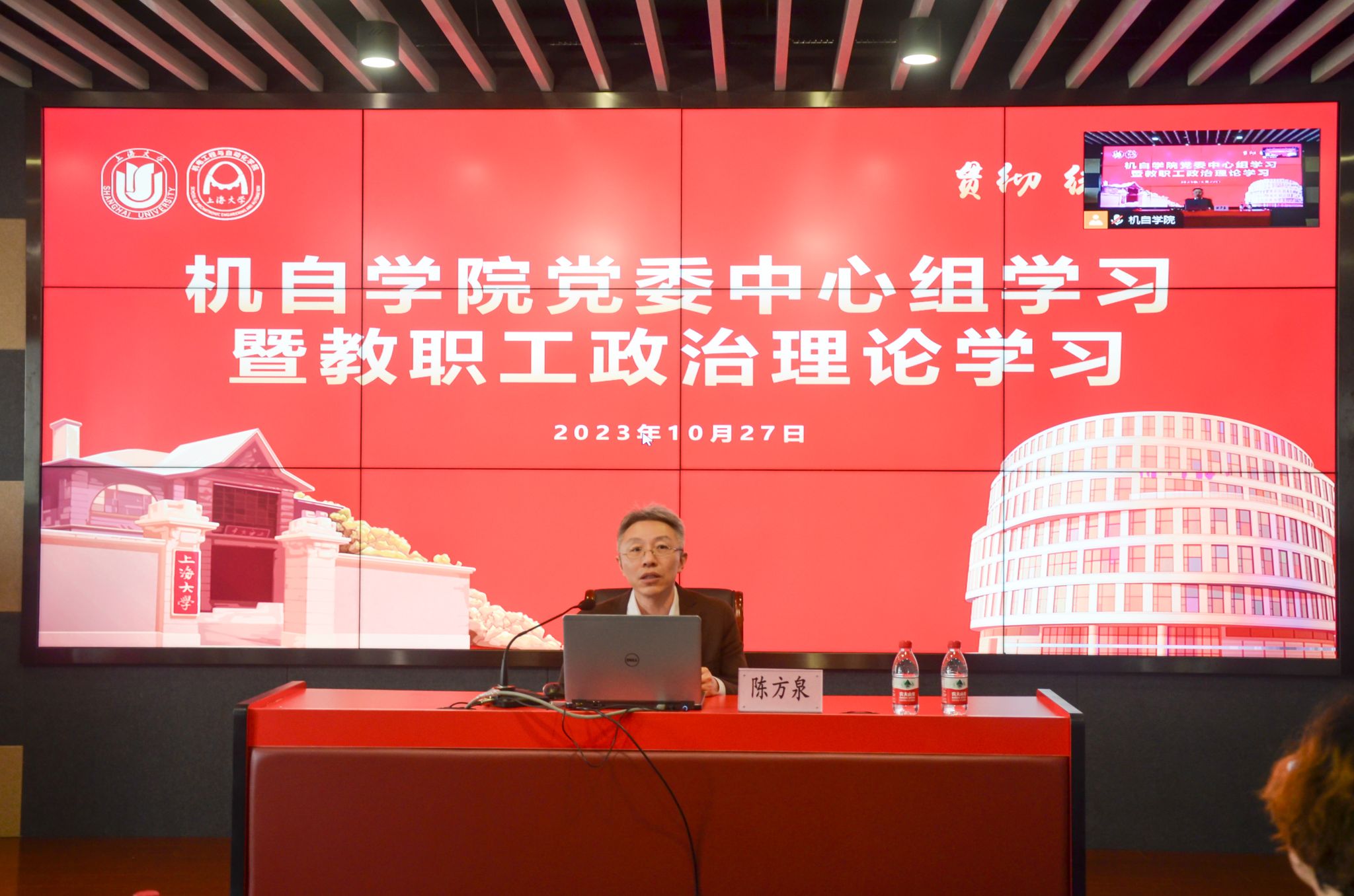 2023年10月27日下午,我院在伯时会堂召开党委中心组学习暨教职工政治理论学习会。学院邀请上海大学马克思主义学院教授、马克思主义理论专业博士生导师张丹华老师作“世界变乱交织,中国笃行担当”的专题辅导报告。我院党委中心组成员、全体教职工通过线上与线下相结合的方式参加了此次学习会,会议由学院党委书记陈方泉主持。