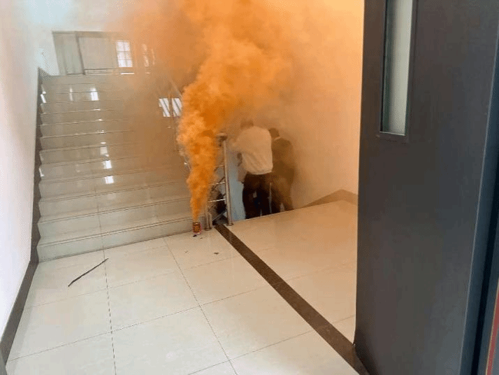讲座后,接着开展的是模拟楼内起火的紧急疏散演练。在消防科朱佳贤、邵敏珂和院研工辅导员王尧的布置下,志愿者们向参与人员发放了毛巾并引导大家进入演练准备状态。随后,疏散演练正式开始。随着烟雾弹的点燃,通道内烟雾弥漫,警报声紧接着响起。全体工作人员立刻采取行动,通知师生立刻离开房间,用湿毛巾捂住口鼻,低姿、快速、有序地从安全通道楼梯尽快撤离。3分钟内,所有演练人员顺利撤出大楼并在机自大楼门前集中,有效证明了师生们良好的消防安全意识和快速的反应能力,疏散模拟活动成功完成!