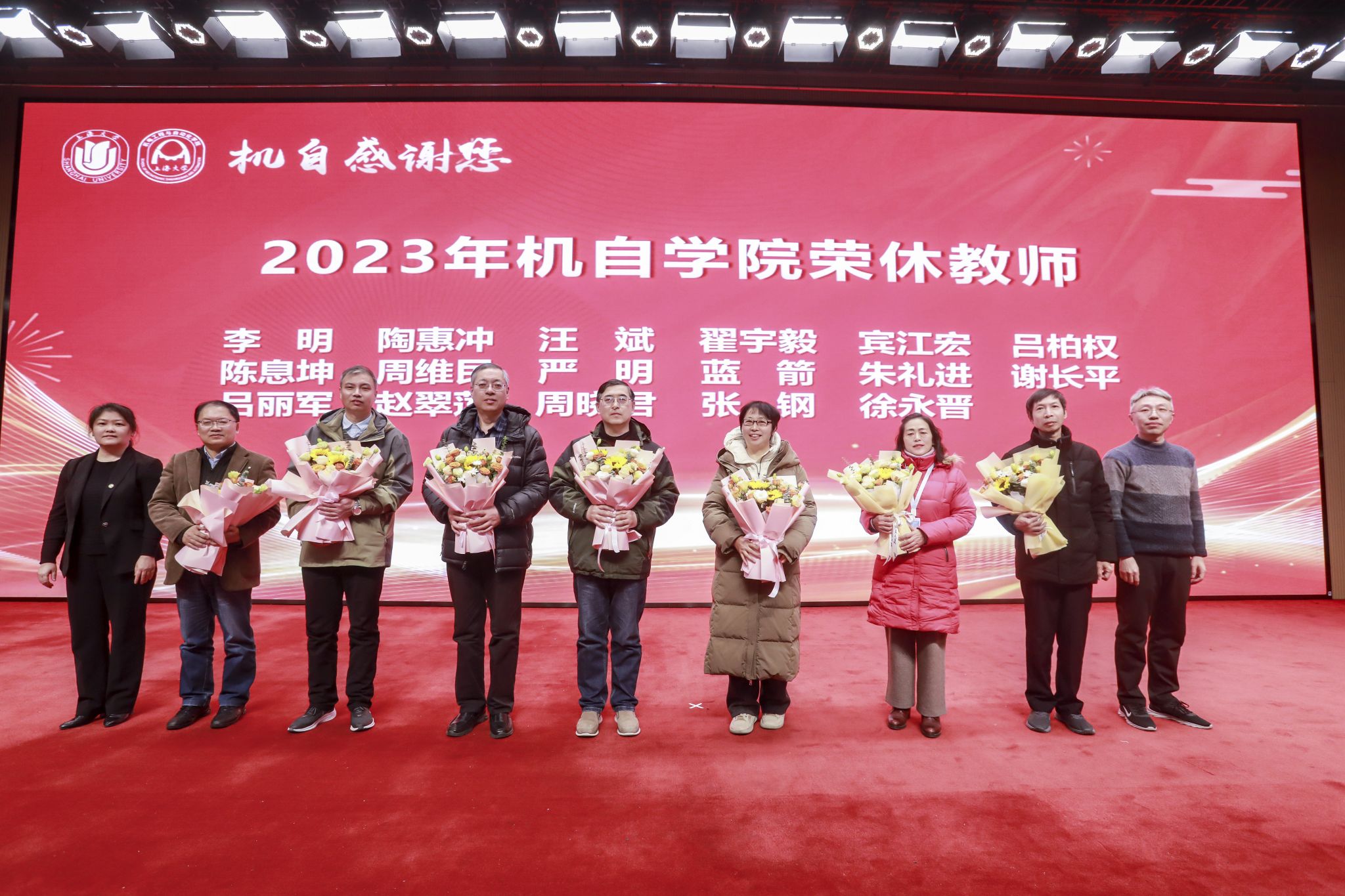 退休教师老师代表深情回顾了从教工作经历,并对学校和学院发展送上真挚的祝福。陈方泉书记和于瀛洁院长向2023年退休教师代表献花,并对他们多年的辛勤付出表示衷心感谢和崇高敬意。