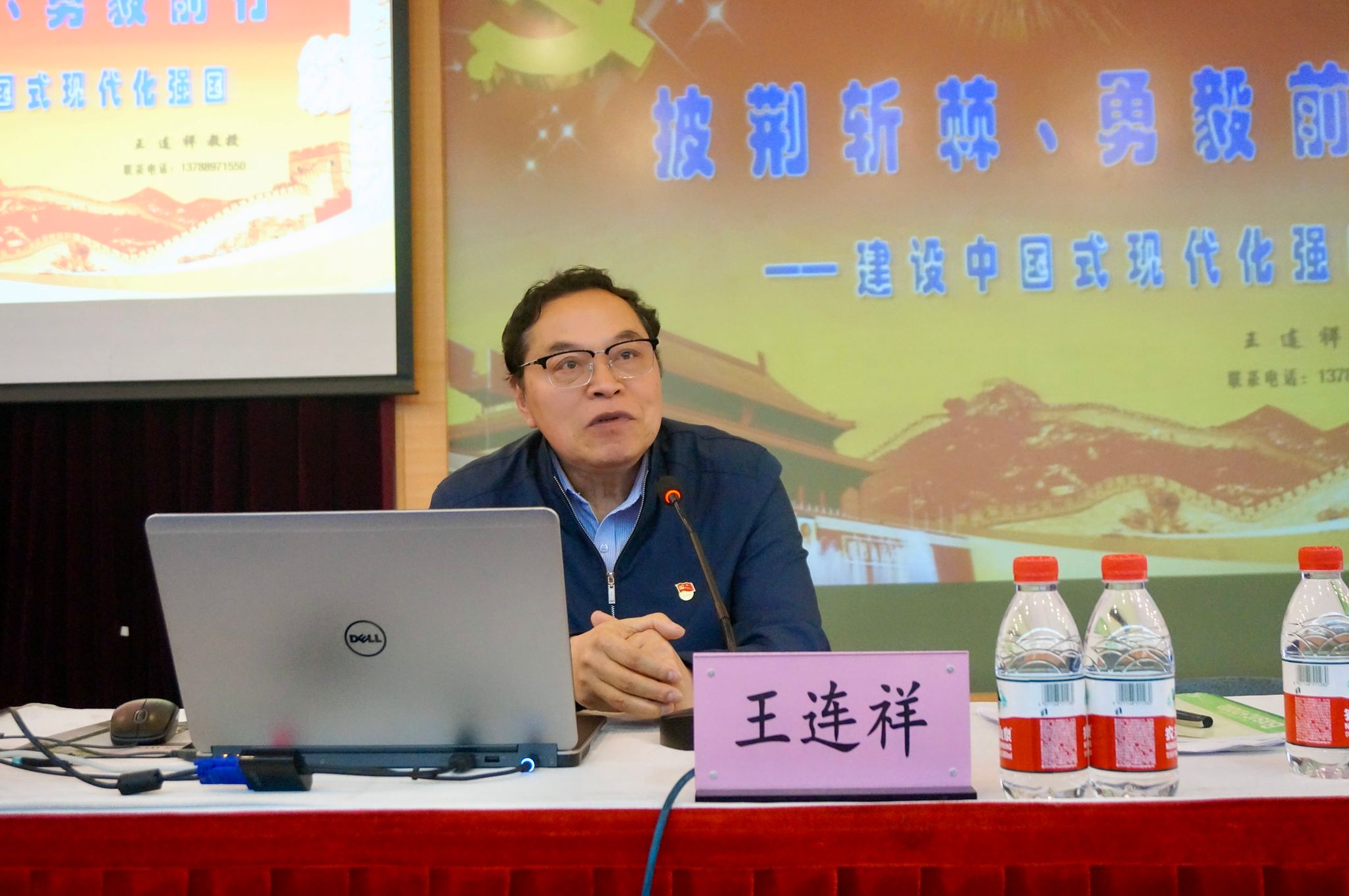 2024年5月11日,我院党委中心组学习、师生党员基本培训、教职工政治理论学习会在宝山校区J202主会场及5个分会场举办。本次会议特邀原上海市委宣传部党校教研室副主任、上海工会管理职业学院干部培训中心主任王连祥教授,为党员师生带来以“披荆斩棘,勇毅前行——建设中国式现代化强国”主题讲座。讲座线上线下同步进行,全体教职工和学生党员共同参会,会议由学院党委书记陈方泉主持。