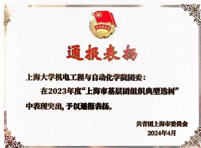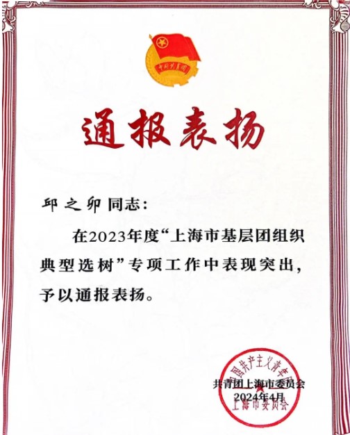 在2023年度上海市基层团组织典型选树工作评选中,yl6809永利官网团委获集体通报表扬,我院团委书记邱之卯获个人通报表扬。