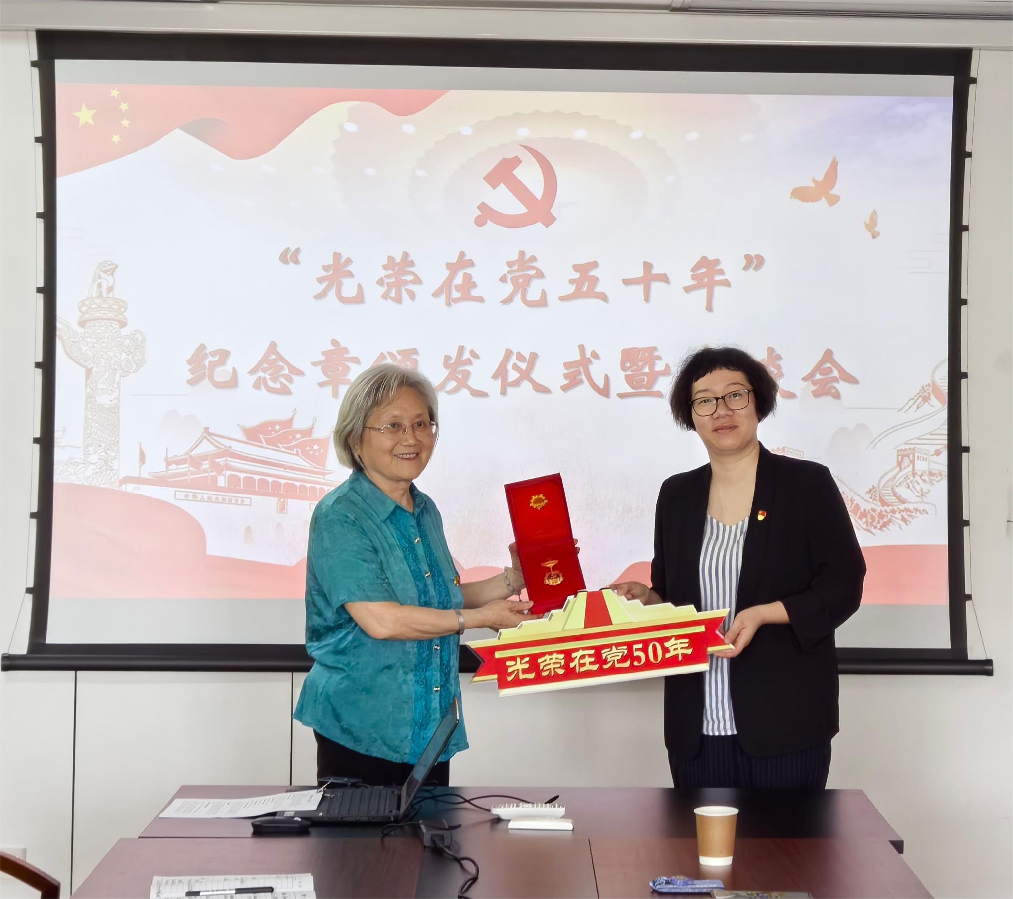 仇静豪书记为陈荣莲老师颁发了“光荣在党50年”纪念章,并向其表示热烈的祝贺和崇高的敬意。陈老师结合自身的工作经历,向与会教师分享了在党50年的心路历程,为大家上了一堂“生动的党课”,展现出老同志时刻牢记党员身份,勤勉敬业、勇挑重担、吃苦耐劳的优秀品质。