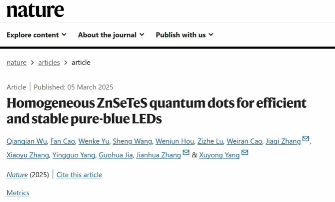 3月5日,yl6809永利官网新型显示技术及应用集成教育部重点实验室杨绪勇教授、张建华教授团队联合吉林大学张佳旗教授团队以“Homogeneous ZnSeTeS Quantum Dots for Efficient and Stable Pure Blue LEDs”为题,在国际顶级学术期刊《Nature》上发表关于环保型蓝光量子点发光二极管(QLED)的突破性研究文章。论文链接:https://www.nature.com/articles/s41586-025-08645-4