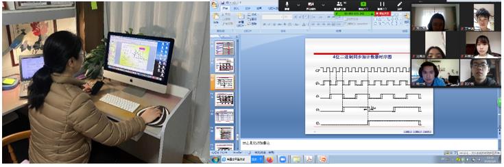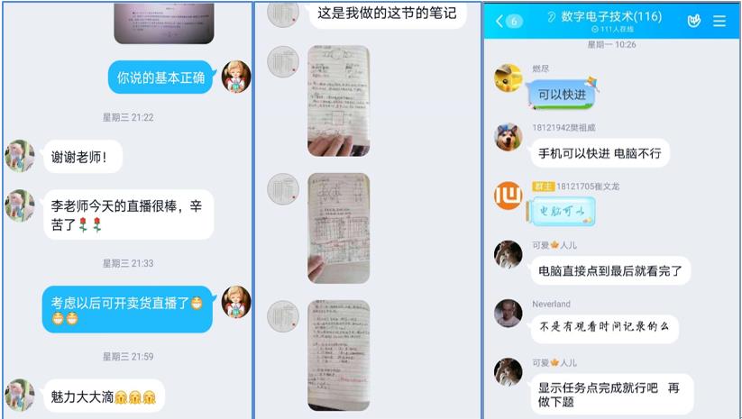 师生多渠道互动,保障学习通道畅通。专业基础课《模拟电子技术A》与《数字电子技术》的任课老师深知课程内容的网上讲授、答疑对屏幕另外一端的学生顺利学习的重要性。课程组老师们为了保障网上直播授课的顺利进行,课前多次组队进行软件平台测试、演练,以确保软、硬件平台良好运行。李智华老师本学期担任《模拟电子技术A》(班级105人)和《数字电子技术》(班级111人)两门课的教学。通过网络,结合上海大学网络教学平台等工具软件,每周四次的课堂教学,以及课后答疑、作业批改,李老师将大量时间与精力用于网课准备、视频录制以及课程互动上。