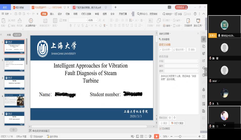 郑华东老师主讲的《专业英语》是面向不同专业背景研究生的,同时还有来自巴基斯坦、喀麦隆、南非的三位外国留学生。虽然大家的英语阅读能力都不错,但除了这三位留学生,大部分学生的英语口语能力较弱,尤其是利用英语进行学术交流的机会少之又少。为了培养学生的学术英语交流能力,本专业英语课程在教学计划中,安排每一位学生根据自己(或导师的)研究方向,阅读至少5篇英文文献,做一次15分钟左右的全英文学术报告,老师和同学的提问和回答的交流环节也均用英文。受疫情影响,后续课程以线上教学方式(微信群+腾讯会议)进行。做报告的同学在上课之前将PPT发送到班级微信群,方便本班师生提前查阅,做报告时则采用腾讯会议屏幕共享的形式在线直播方式进行全英文学术报告,取得良好的效果。课程出勤率达100%,听课同学提问积极,做报告的同学认真回答问题,在线互动交流良好,很好地锻炼了同学们的学术英语表达能力,取得了良好的教学效果。