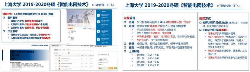 研究生文献阅读课程《智能电网技术》是由汪飞老师主讲。在备课阶段,汪老师就在上海大学研究生网络教学平台上进行了课程制作、资料上传、教学管理,学习了直播、录屏等多种软件工具,并进行了充分的试课准备。考虑到线上授课的特殊性,担心隔着屏幕学生参与不主动、课堂秩序难监管等,他特意制作了“过程管理”页作为课前共享幕,以便学生登录之后即可看到,利于管理习惯的形成。此外还增加课间休息幕用作给学生增强课堂连续感。
