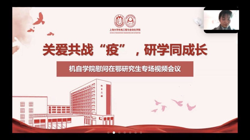 学院费敏锐院长鼓励研究生同学们宅家期间加强自我管理、自我服务、自我教育,并嘱咐大家对论文的选题、创新性、学术性、应用前景、概括总结各个方面进行打磨提升,为返校之后的实验数据的补充打下基础。于瀛洁书记代表学院表达了对所有老师同学的辛勤付出的肯定和鼓励,对在鄂研究生的关心和牵挂。希望老师和同学们要保持密切交流和沟通,确保线上教学和云端科研的有效开展。最后祝福全体师生身体健康,希望大家共度疫情,在春暖花开的时节相聚上大。