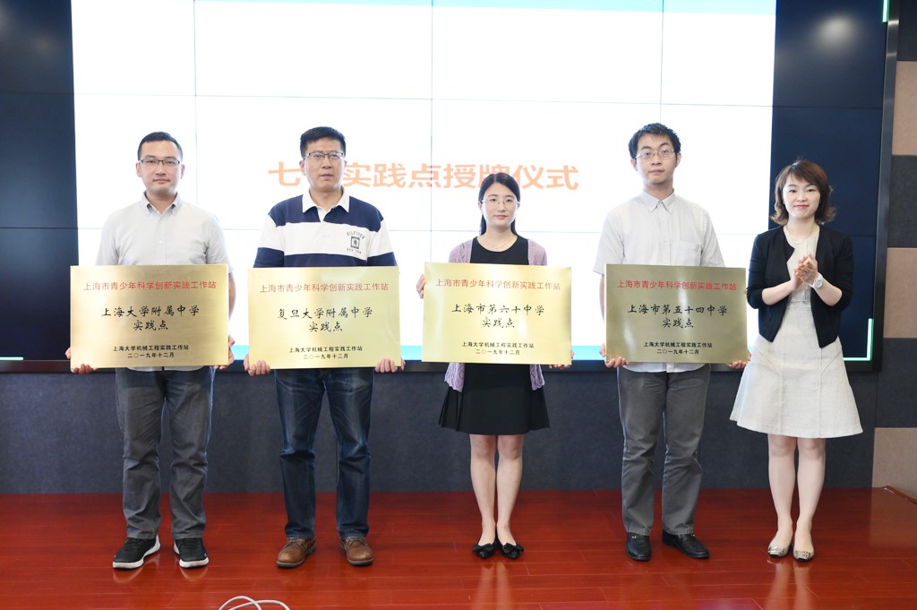 上海市科学技术委员会科普工作处钟倩处长为上海大学机械工程实践工作站所设的四个中学实践点授牌。复旦大学附属中学教务处副主任杜程鹏老师、上大附中科训处副主任汪玥辉老师、上海市第六十中学创新实验中心常务副主任陈硕老师、上海市第五十四中学教导处副主任叶丛啸老师上台接受钟倩处长的授牌并合影留念。