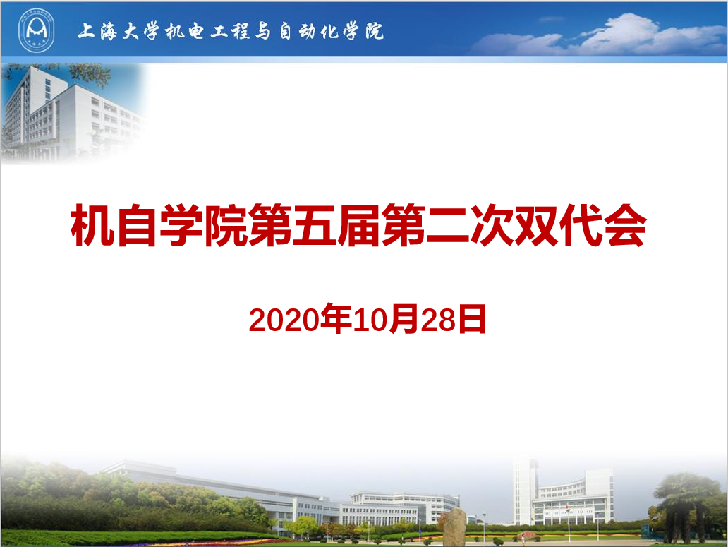 10月28日9点,我院五届二次双代会在机自大楼伯时会堂顺利举行,学院党委书记于瀛洁、院长费敏锐、院党政班子成员,校院两级双代会代表参会。学院还邀请了各系班子成员、青年教师、民主党派代表列席会议。会议由学院工会主席林桦主持。