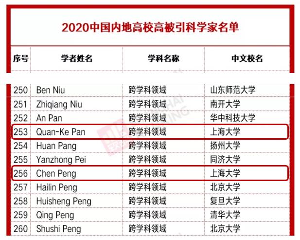 2020年上海大学共8位教授上榜,入选人次数量列内地高校第20位,上海高校第3位。我院彭晨教授、潘全科教授入选此次“高被引科学家”名单。