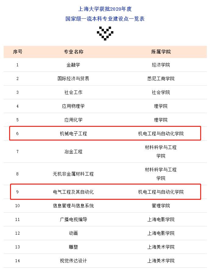 日前,教育部办公厅印发《关于公布2020年度国家级和省级一流本科专业建设点名单的通知》,上海大学14个专业入选2020年度国家级一流本科专业建设点,其中我院机械电子工程,电气工程及其自动化2个专业入选。