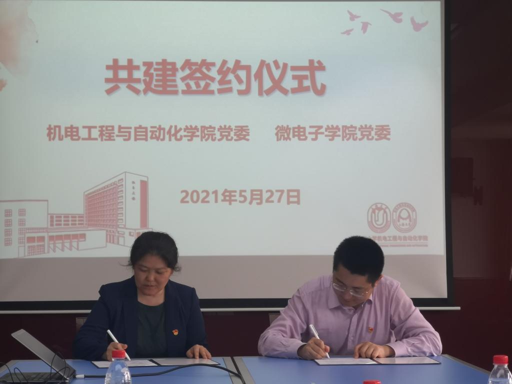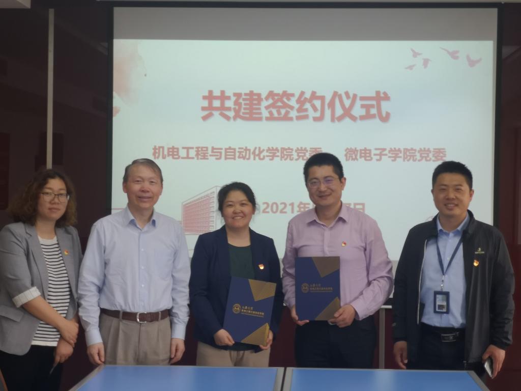 为了对接学校“十四五”期间理工科“五朵金花”战略布局,推动基层党建与学科发展双融合、双促进,更好落实学党史、悟思想、办实事、开新局的党史学习教育要求。5月27日,我院党委与微电子学院党委在校本部东区机自大楼604室举行党委共建签约仪式,我院党委书记于灜洁,我院院长费敏锐,微电子学院党委书记许烁,我院党委副书记、纪委书记仇静豪,微电子学院党委副书记张桂杰以及教师代表参加了本次签约仪式。