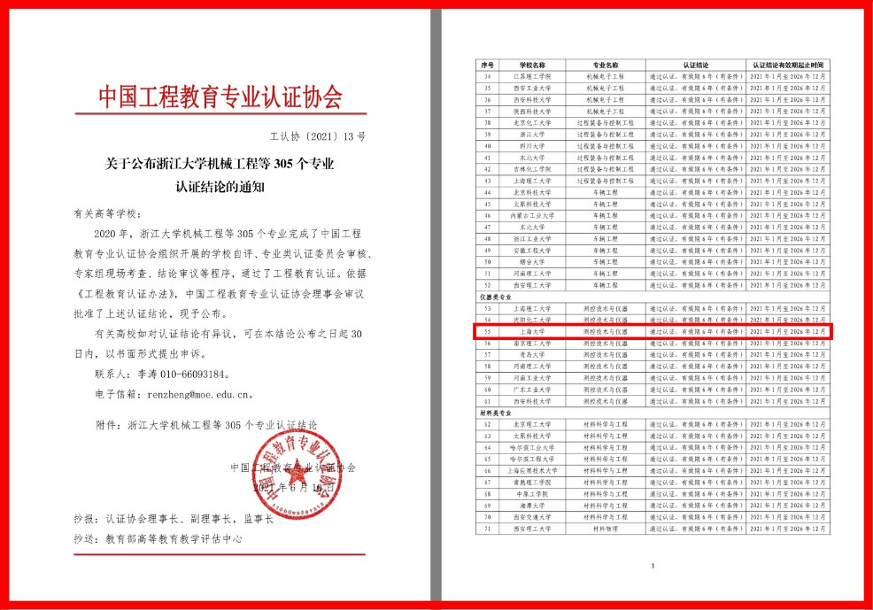 近日,中国工程教育专业认证协会发布《关于公布浙江大学机械工程等 305 个专业认证结论的通知》(工认协〔2021〕 13 号),公布了2020年全国工程教育专业认证的认证结论。我校测控技术与仪器专业经过认证申请、申请审查和受理、自评报告撰写和审查、工程教育认证协会专家组进校考查、专业认证委员会审议、认证结论审议委员会审议等程序,正式通过了工程教育专业认证,认证时效为6年(2021 年 1 月至 2026 年 12 月)。