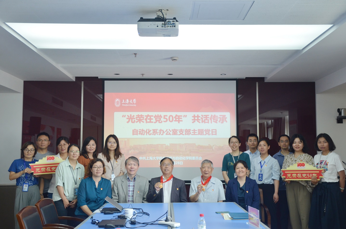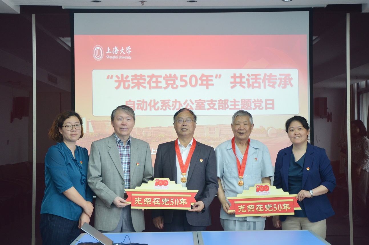 6月28日下午,自动化系在机自大楼604会议室举行了“‘光荣在党50年’共话传承”主题党日。学院党委书记于灜洁、院长费敏锐分别向刘继发和张扣林两位老党员颁发纪念章并赠送礼品,以表达学校、学院对老党员的敬意和问候。