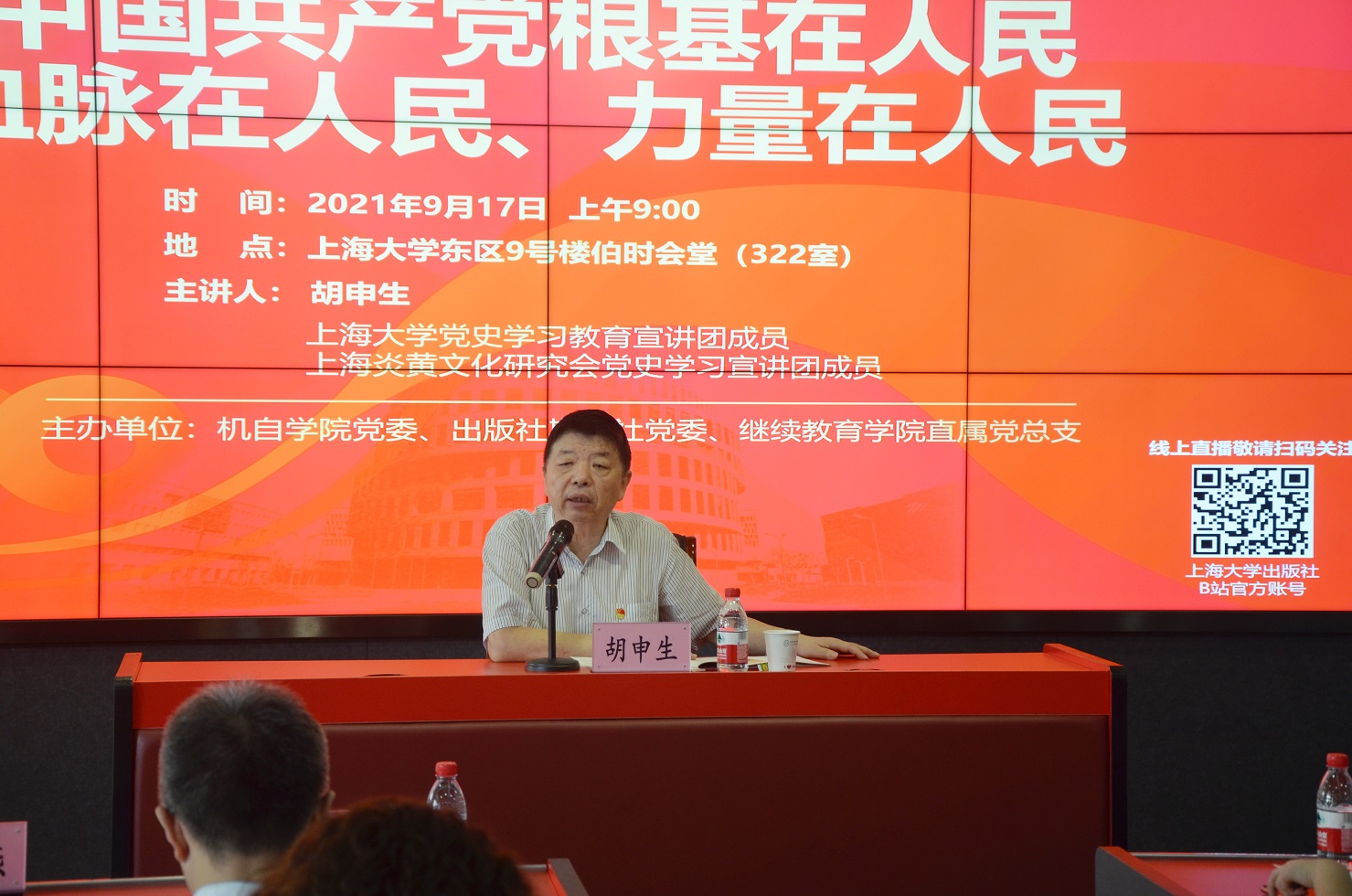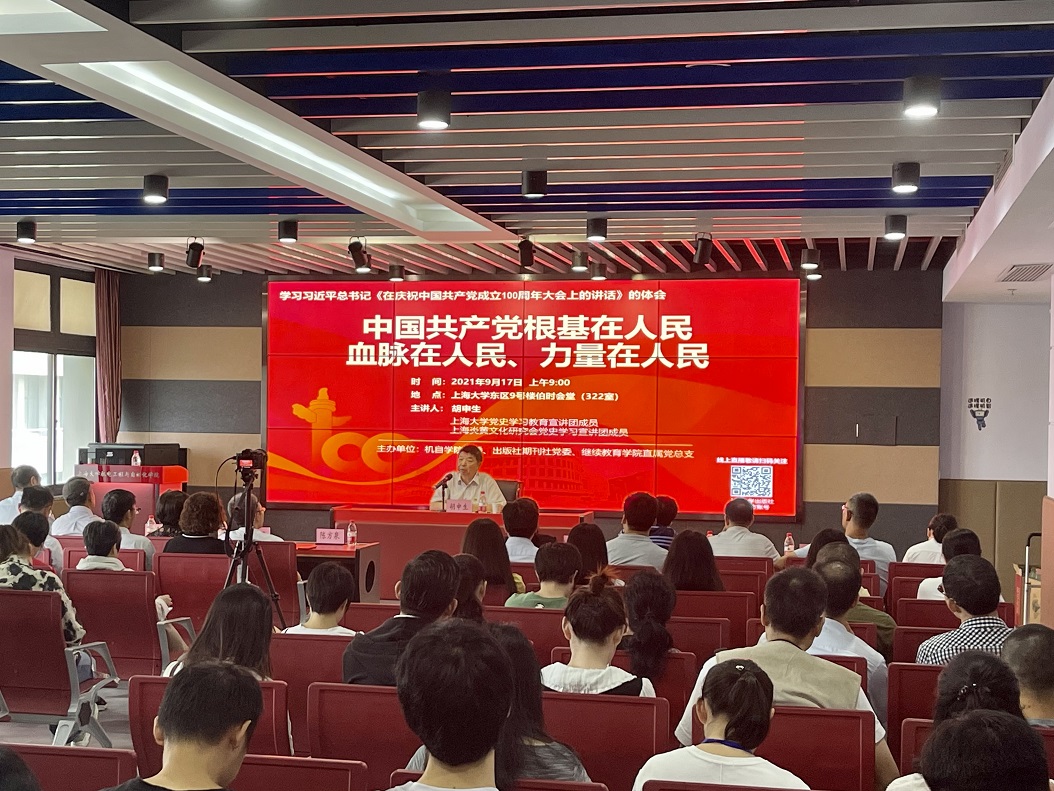 2021年9月17日上午,在宝山校区东区9号楼伯时会堂,我院党委、出版社期刊社党委、继续教育学院直属党总支三家单位开展联组学习。本次联组学习特邀著名社会学家、上海大学党史学习教育宣传团成员、上海炎黄文化研究会党史学习宣讲团成员胡申生教授,为与会教师带来“学习习近平总书记《在庆祝中国共产党成立100周年大会上的讲话》的体会——中国共产党根基在人民、血脉在人民、力量在人民”的讲座。上海大学出版社社长戴骏豪,继续教育学院直属党总支书记王海燕,我院党委书记陈方泉,院长于瀛洁,出版社期刊社党委副书记杨利明,继续教育学院党总支副书记、副院长严惠根,继续教育学院副院长王惠珏,以及三家单位教职工、学生党员代表等出席了本次学习活动。我院活动线上线下同时进行,哔哩哔哩视频网站同步直播。联组学习由陈方泉书记主持。