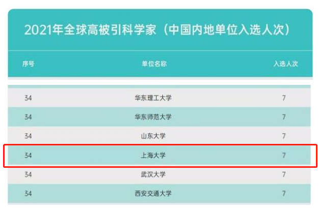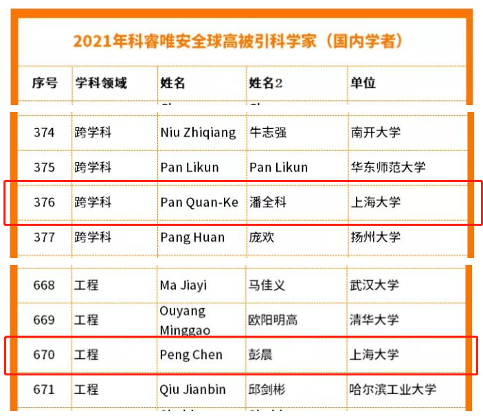 2021年11月16日,科睿唯安发布 2021年度全球 “高被引科学家” 名单。上海大学共7位教授上榜,其中我院彭晨教授、潘全科教授再次入选该名单。