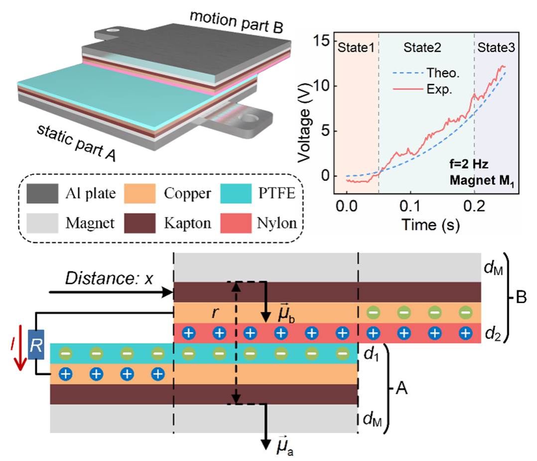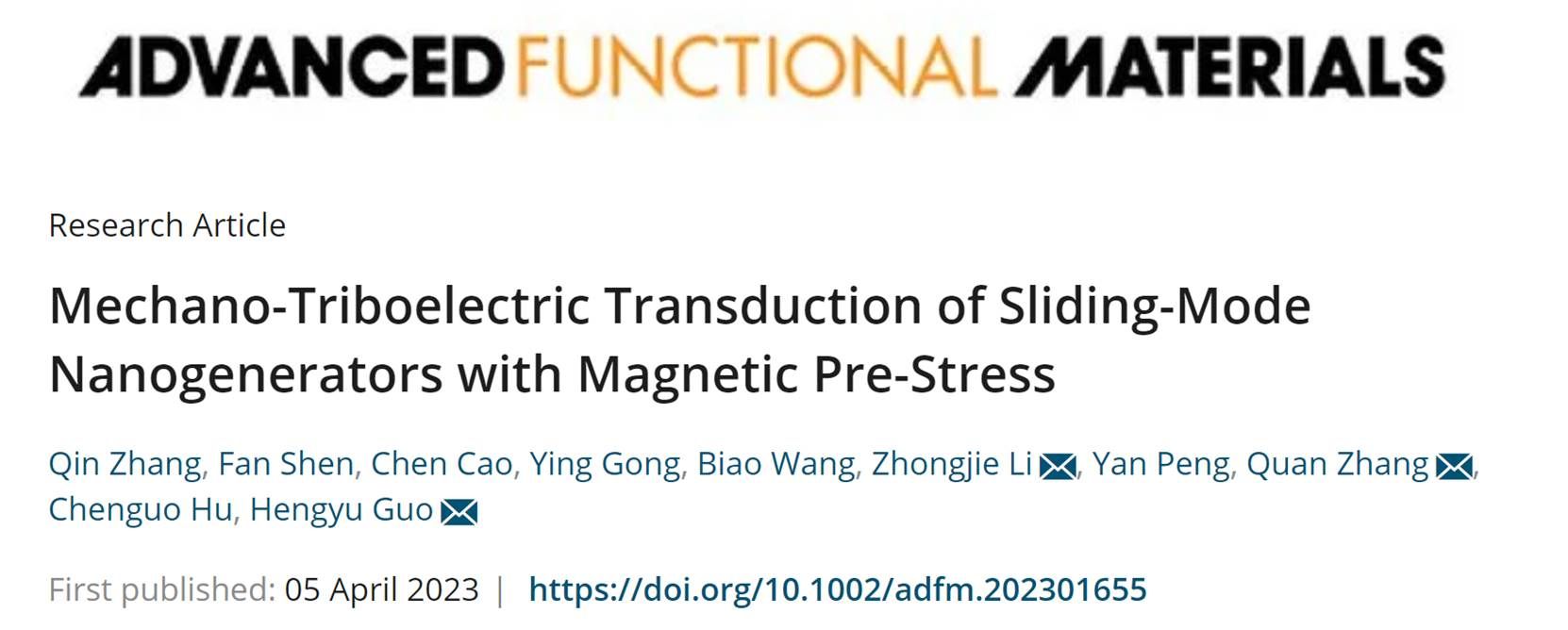 近日,我校我院李忠杰副研究员课题组、张泉副教授与重庆大学郭恒宇教授合作,在国际著名期刊《Advanced Functional Materials》(IF:19.924)上发表题为“Mechano-triboelectric Transduction of Sliding-mode Nanogenerators with Magnetic Pre-stress”的研究论文。