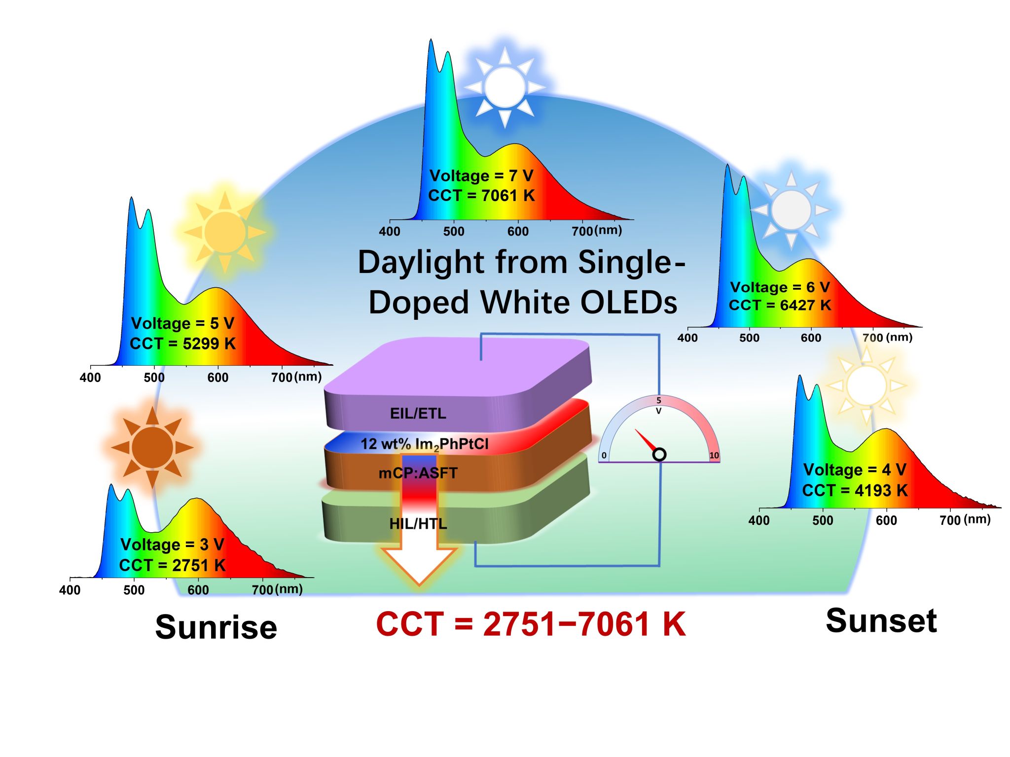 该工作利用甲基基团调节铂(II)金属配合物的Pt∙∙∙Pt相互作用,从而实现色温(CCT 2751−7061 K之间)可调、高显色指数、高效率低滚降的白光OLED。通过简单地改变驱动电压,此白光OLED可以模拟太阳从黎明日升到黄昏日落,为未来人们在室内享受日光浴提供了研究基础。新型显示重点实验室王子兴副研究员和德国卡尔斯鲁厄理工学院(KIT)的Stefan Bräse教授为共同通讯作者,上海大学为第一完成单位。
