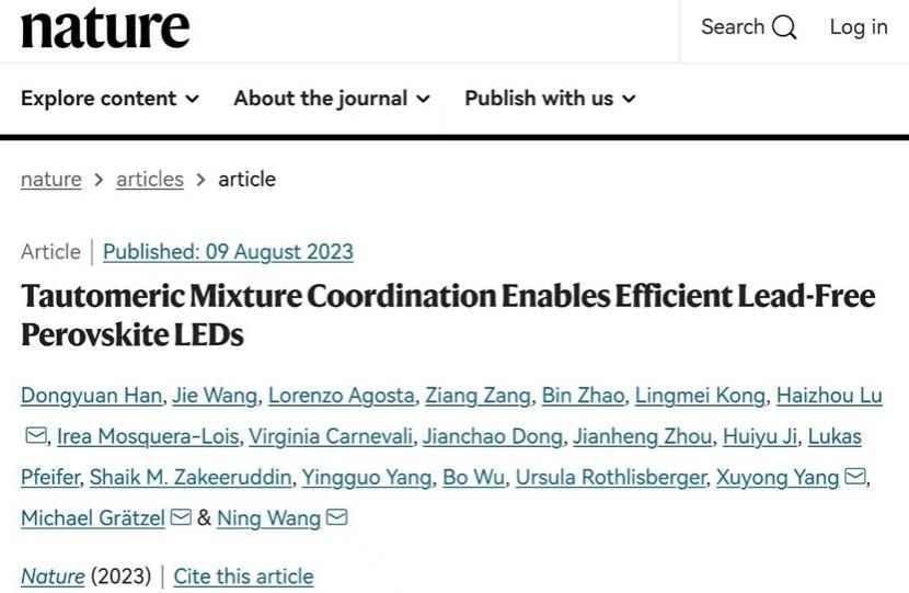 2023年8月9日,国际著名期刊《Nature》以Accelerated Article Preview(加速预览)的形式在线刊发了yl6809永利官网新型显示技术及应用集成教育部重点实验室杨绪勇教授课题组最新合作研究成果“Tautomeric Mixture Coordination Enables Efficient Lead-Free Perovskite LEDs” (DOI: 10.1038/s41586-023-06514-6)。