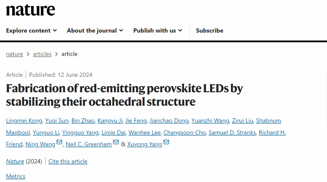 2024年6月12日,yl6809永利官网新显教育部重点实验室杨绪勇教授研究团队与合作单位团队关于“稳定钙钛矿八面体实现高效红光LED”最新研究成果,以Fabrication of red-emitting perovskite LEDs by stabilizing their octahedral structure为题在国际顶尖期刊Nature上发表,论文链接:https://www.nature.com/articles/s41586-024-07531-9。