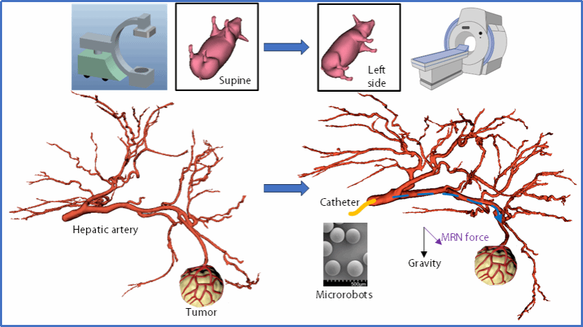 在此背景下,研究组提出了用于预测血管内微型机器人相对于患者的最佳重力位置导航算法,并结合临床磁共振成像(MRI)的磁场梯度,有效提高了磁性微型机器人在大型活体(猪)的肝脏靶向效率。研发了专用微型机器人注射器、高精度MRI兼容压电血流控制系统,基于临床MRI成功地将磁性微型机器人注入到12头活猪(每头猪大约注射2000个,每个磁性微型机器人200微米)的肝动脉,并实现目标肝叶地导航,在通过多分支的肝动脉血管后,与对照组(n=4)相比,达到四个不同目标肝叶的磁性微型机器人数量在导航组中(n=8)增加了 1.7 至 2.6 倍。对19例肝细胞癌(HCC)患者进行仿真表明,所提出的技术可以满足HCC患者肝动脉栓塞的需求。研究组提出的技术为基于外部驱动源的微纳米机器人在人类尺度上的导航提供了可选择的方向。