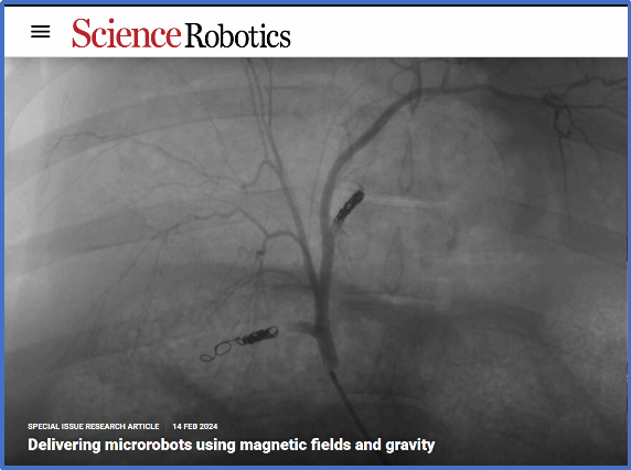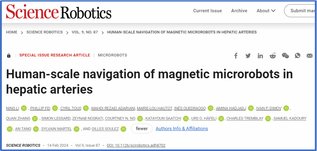 近日,yl6809永利官网张泉教授团队联合国内外合作者,在Science子刊《Science Robotics》(机器人领域排名第一)以共同通讯作者发表题为“Human-scale Navigation of Magnetic Microrobots in Hepatic Arteries”的研究工作。