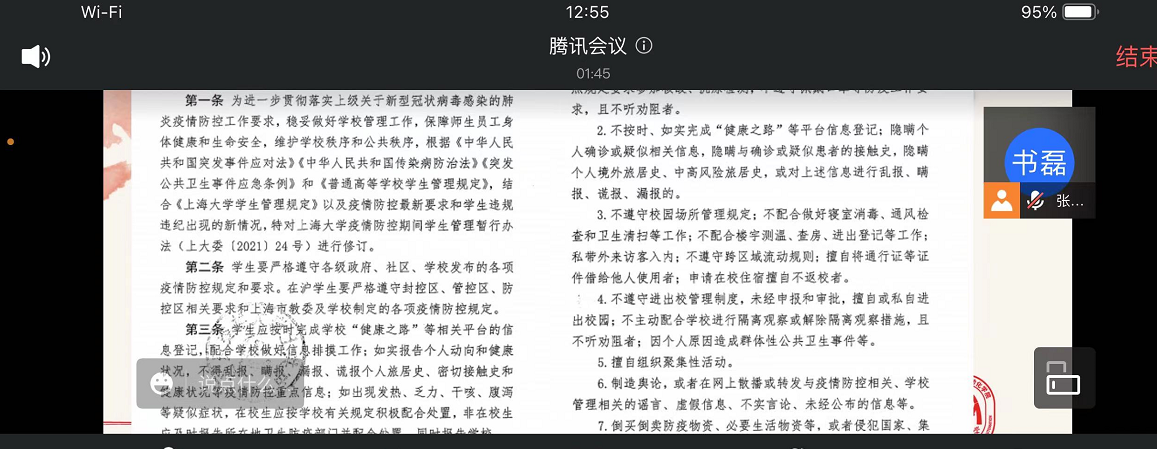 机自系2019级本科生在线形式学习了学校防疫管理规定,张书磊老师、黄辉老师传达了两委精神,对学校疫情防控的现状进行了分析,勉励同学们对学校疫情防控坚定信心,携手努力,共同迎接疫情防控的最终胜利。两位老师还就返乡回家一些注意事项跟同学进行了在线交流,为同学们发展规划做积极指导。