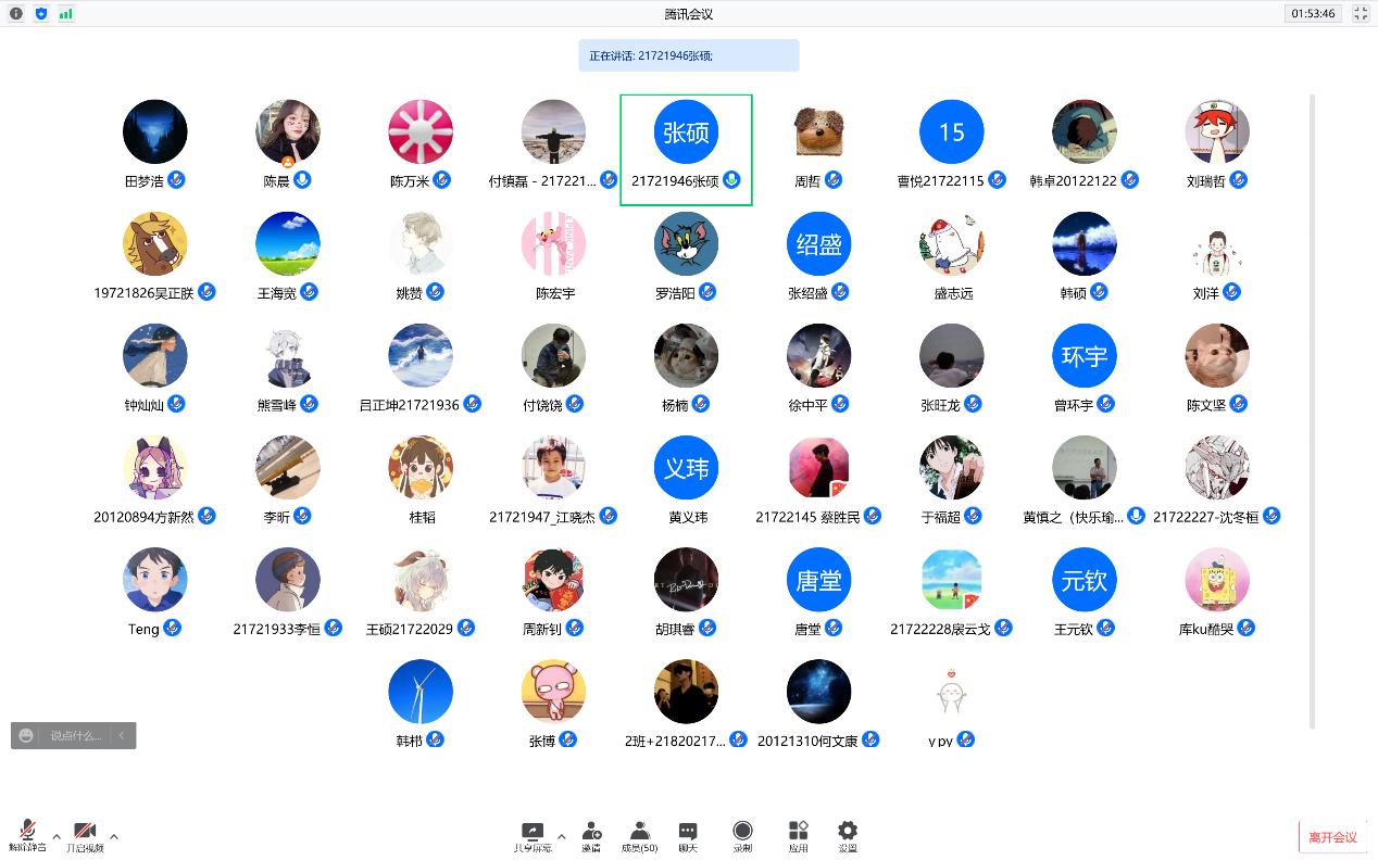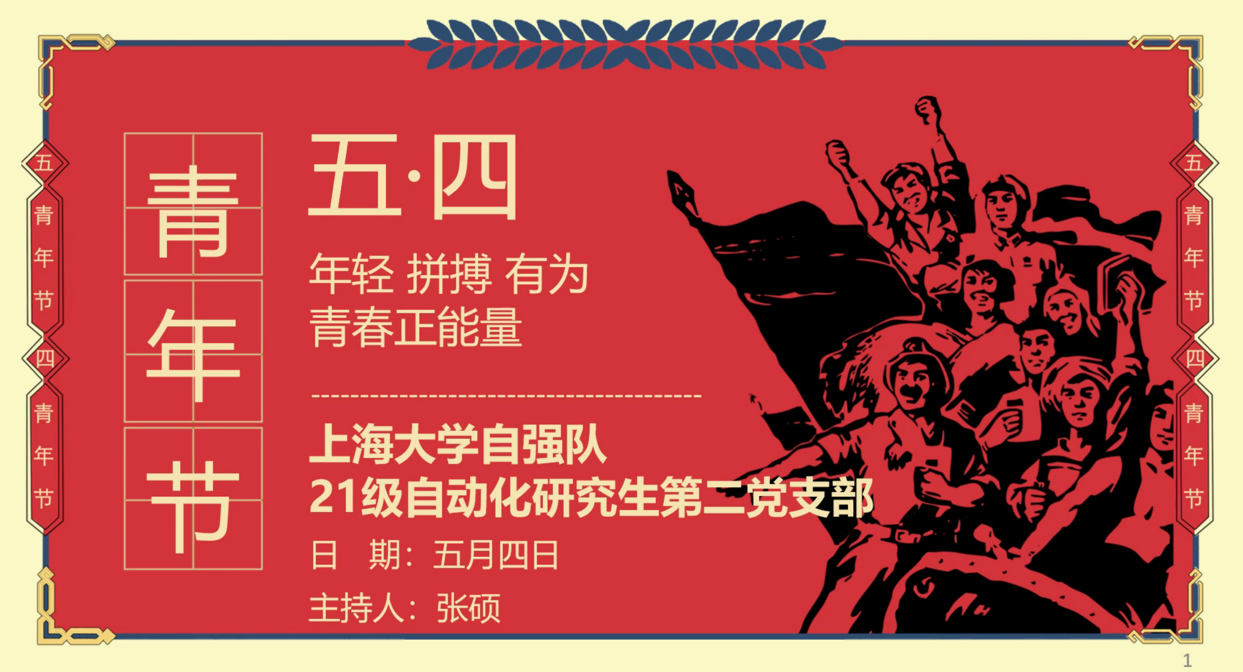 恰逢五四青年节到来之际,为缅怀革命先烈,发扬五四精神,增强广大学生的使命感和责任感,在自强队指导老师王海宽、李昕、韩栉和黄慎之老师的带领下,自强队在读的研究生、本科生队员、21级自动化研究生第二党支部等学生和前自强队指导老师陈万米共五十人共聚云端,迎来了一场特殊的相遇。自强队一直保持着在五四青年节开展一些有意义活动的传统。由于今年疫情影响,学校进行封闭管理,自强队大家庭虽没能在线下聚首共庆五四,但在云端相聚也丝豪不影响自强队青年们对弘扬五四精神的那份热情,学五四精神,传递自强队精神——自强不息;先天下之忧而忧,后天下之乐而乐。