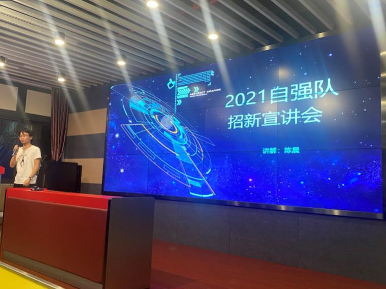 招新宣讲活动由自强队研二的陈晨主持,首先播放了指导老师陈万米发来的视频讲话,主要介绍了自强队的概况和对学生的鼓励。然后由陈晨与同学们回顾了自强队的建设与发展,建队20年来,自强队参加各类国际国内大赛获得过国家级以上奖项320余项,自强队培养的受益的学生近万余人,大批毕业学生直研、考入985高校或出国深造,自主创业的学生也不在少数,其中大多数学生进入工作单位后成为相关企业中坚力量和技术骨干。