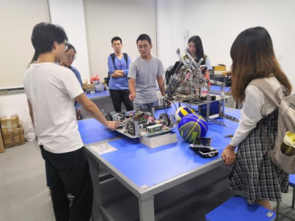 在后面的时间里,在各组的负责人的带领下,参观了各组的实验室。投篮机器人组的大三队员李启阳热情的向大二的同学们介绍队友们自己研制的投篮机器人,讲述了机器人的组成结构、运动机理,展示了机器人如何识别篮球和排球。有趣的识别过程引起了参观学生的兴趣,纷纷向学长问起识别的原理,实验室里一片热闹的景象。刘洋学长和张硕学长给大家展示了家庭服务机器人,大三的老队员蔡逸磊和路方华,为新同学演示了机器人的导航,定位,语音控制等功能,新同学们都被深深的吸引住了,并进行了交流互动。杨楠学姐和邓鑫学长带大家参观了智能车创新实验室,大四保研的老队员舒好、周文捷给参观的同学细致讲解,并分享了他们的坚持与成功的故事,同学们深受启发并表示要向他们学习。
