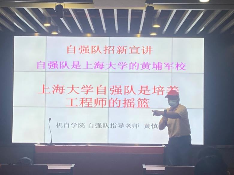 在各组队员招新宣讲完毕之际,黄慎之老师对此次招新活动进行了激情昂扬的演讲。他首先肯定了自强队是一个奋进团结的团队,更是一个弘扬雷锋精神的团队,才有了今天的队员们为宣讲积极准备,并以极其自信的面貌向学弟学妹们分享了他们的成长经历和收获。然后黄老师强调,上海大学自强队是上海大学的品牌团队,是培养工程师的摇篮。黄老师自豪地讲述,自强队就是这样一支强大的队伍,每年毕业的四个研究生中至少有一个人进入华为,甚至四个人中有三人进入华为,今年有范鹏鹏与李潇和本科生黄飞榜进入华为。自强队助力华为,我们可以自豪地说,华为的成长有上大人出的一份力,有自强队出的一份力,我们自强队要为国家培养需要的人才。最后黄慎之老师与同学们重温了钱伟长老校长的教育思想,钱校长指出:“上海大学培养的学生,首先应该是一个全面的人,是一个爱国者,一个辩证唯物主义者,一个有文化艺术修养道德品质高尚、心灵