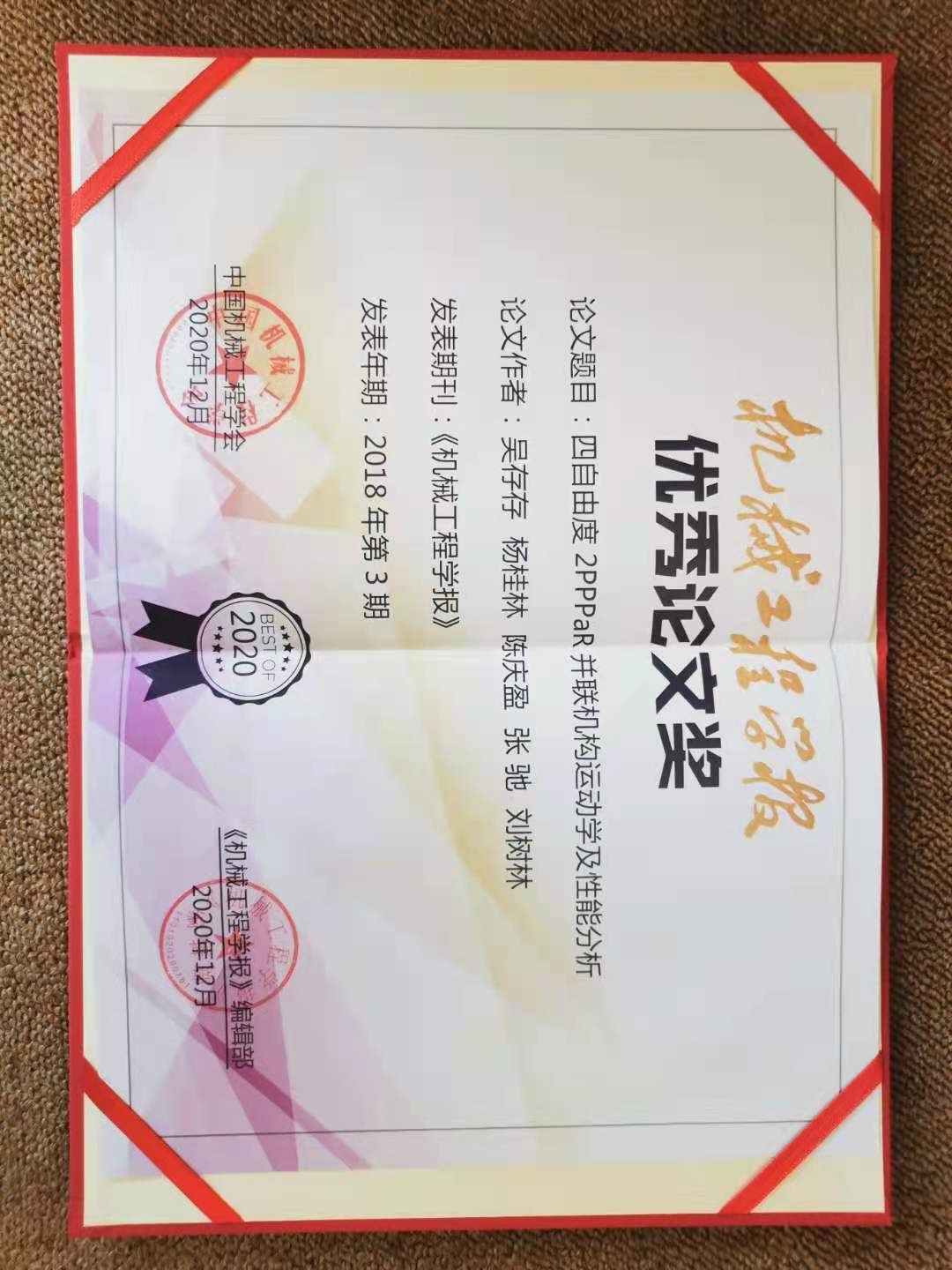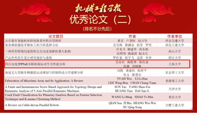 上海大学精密机械工程系硕士生吴存存(导师:刘树林教授)的论文《四自由度2PPPaR并联机构运动学及性能分析》被评为优秀论文。