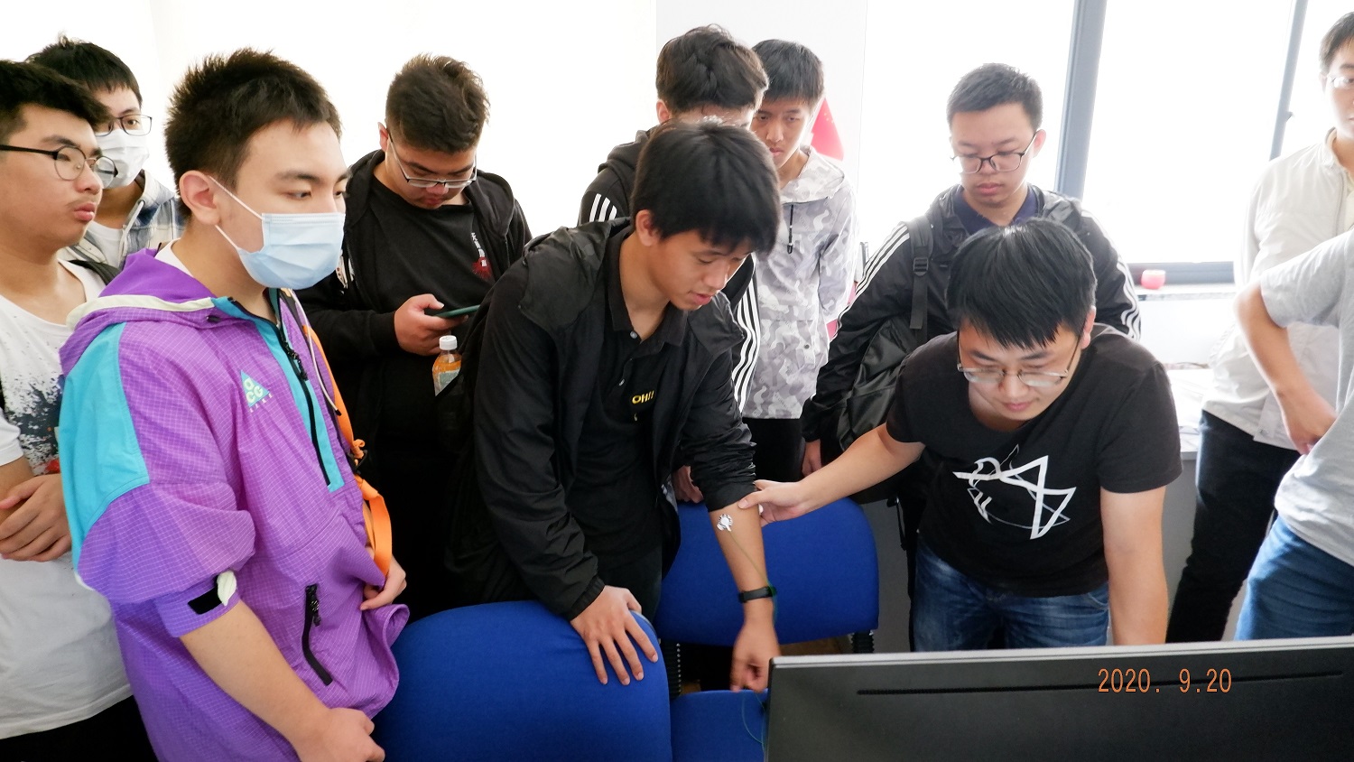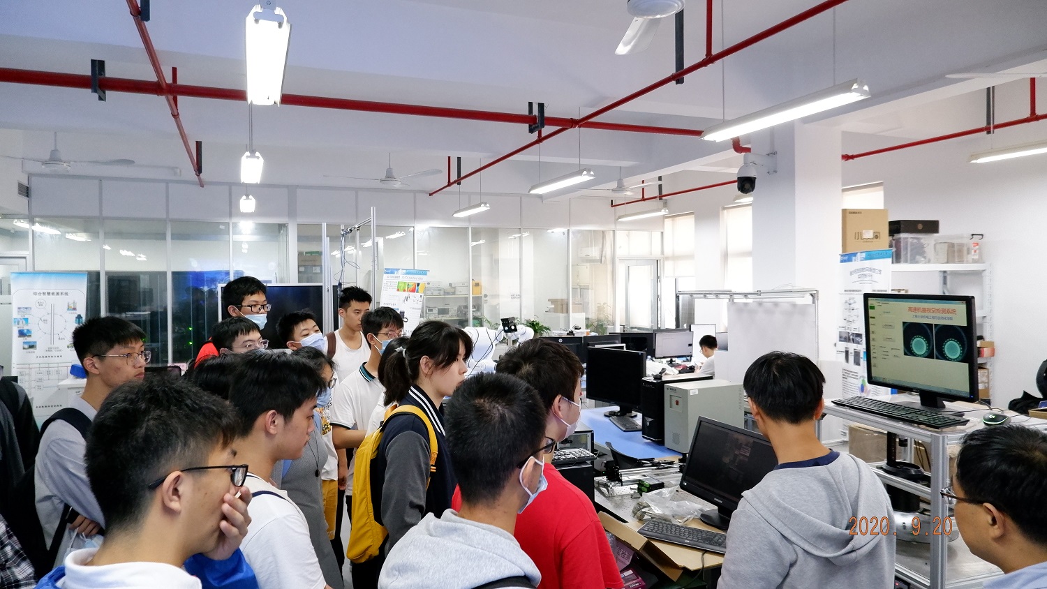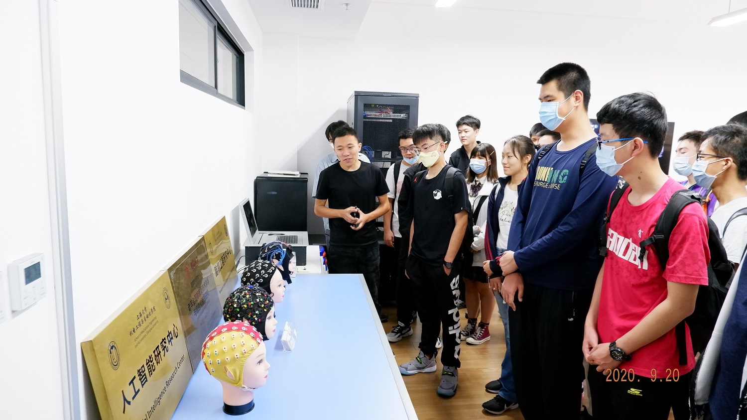 在柯显信站长的带领下,同学们首先参观了杨帮华教授团队的脑机接口实验室。杨教授团队在脑机接口领域连续开展近20年的研究工作,积累了丰富的经验,今年四月受到央视专访。同学们参观了实验室具有自主知识产权的脑机接口设备,大家对脑电波信号处理、脑机接口结合虚拟现实技术非常感兴趣,流连忘返,互动频繁。